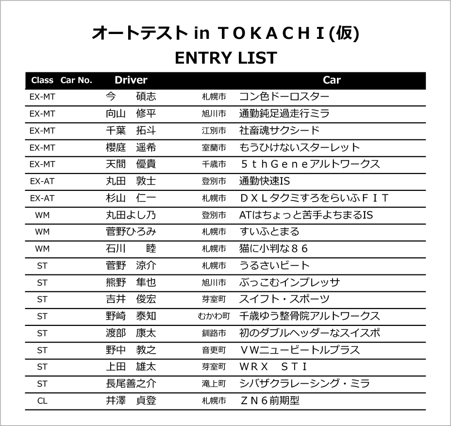 6 | 8/31 | オートテストin TOKACHI(仮) | TOSC | 十勝 | クローズド(F) | ![]() |